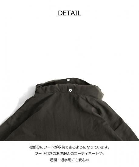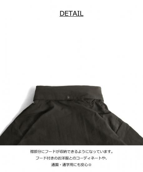フードは襟部分に収納可能で、フード禁止の学校指定にも対応可能です。