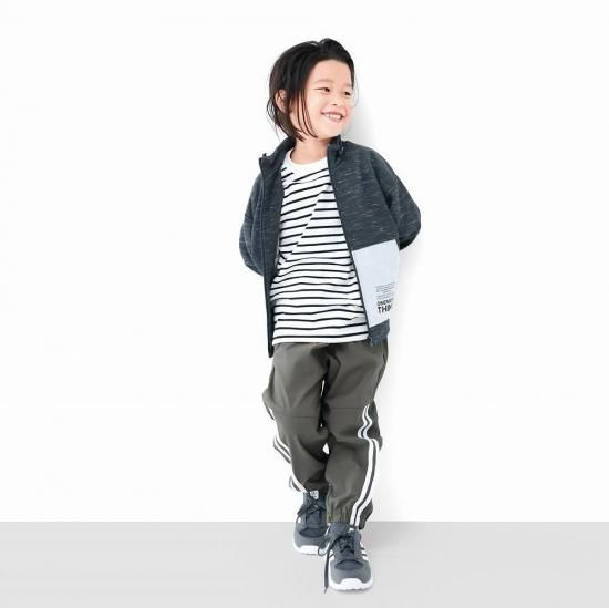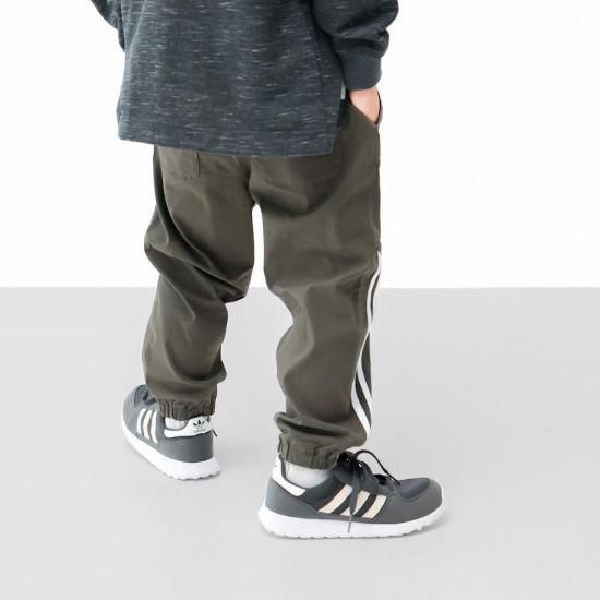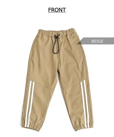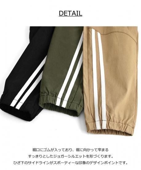 裾に向かって窄まるジョガーシルエットとサイドのラインが、アスレジャーな着こなしを演出。